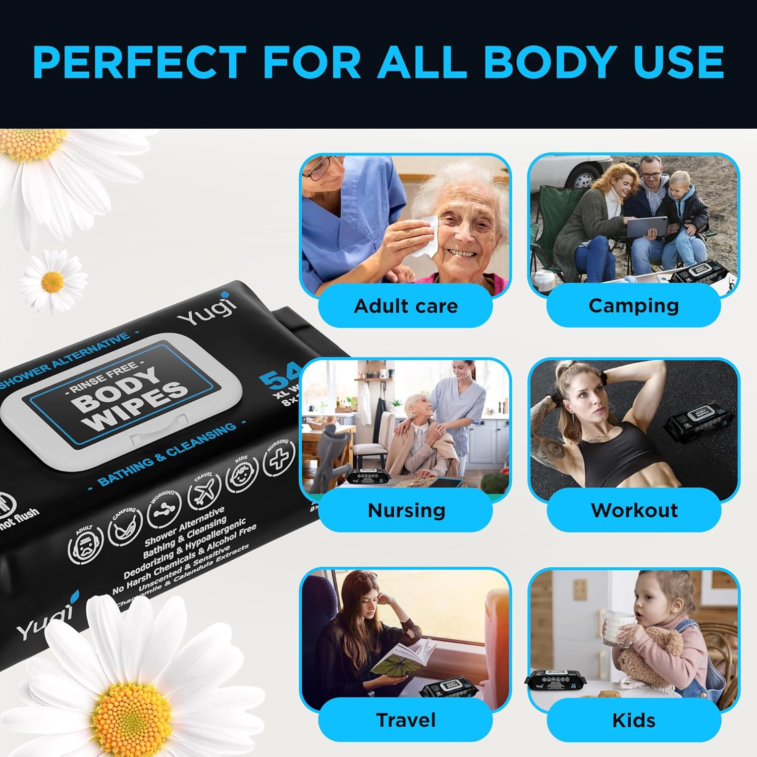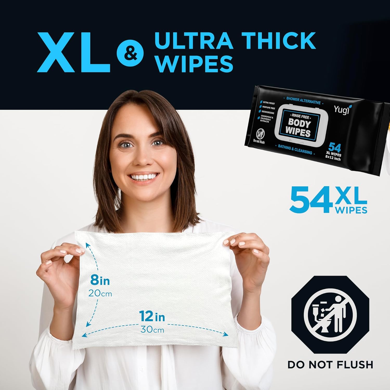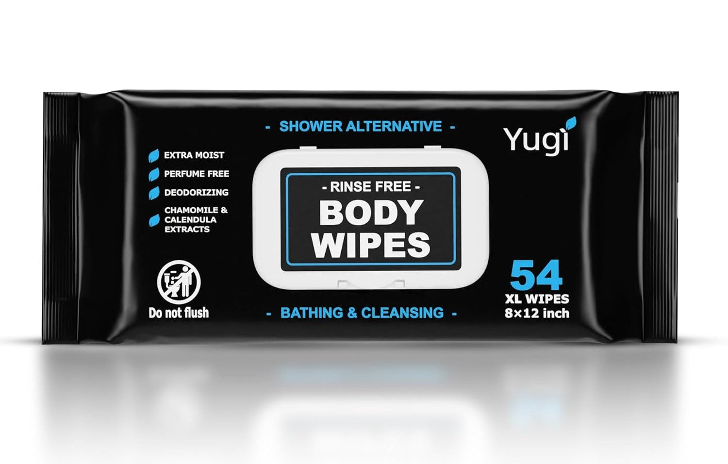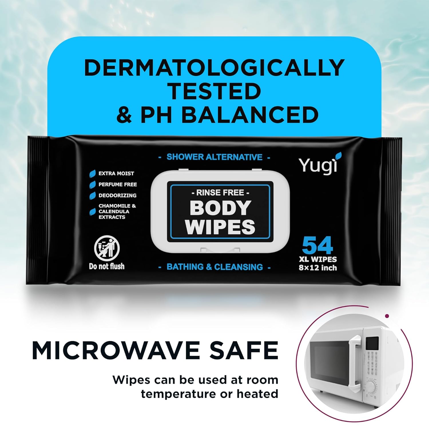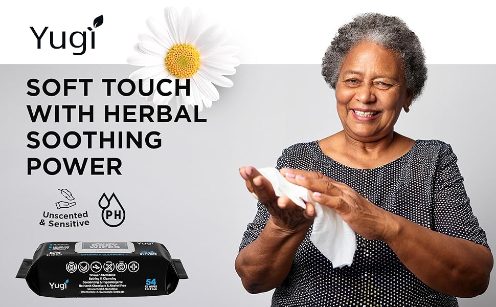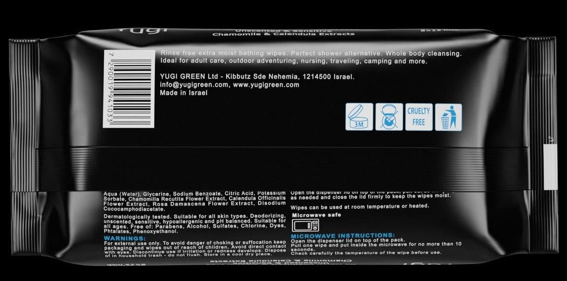 Yugi Adult Body Wipes are ultra-thick, extra-moist no-rinse wipes for gentle, full-body cleansing without water. Ideal for seniors, elderly, bedridden or post-surgery care, and perfect for camping, gym, travel, and nursing use. Made with a plant-based, fragrance-free formula containing over 99% pure water, chamomile, and calendula. Hypoallergenic, pH-balanced, free from harsh chemicals, disposable, and microwave-safe for warm, comfortable use anytime.