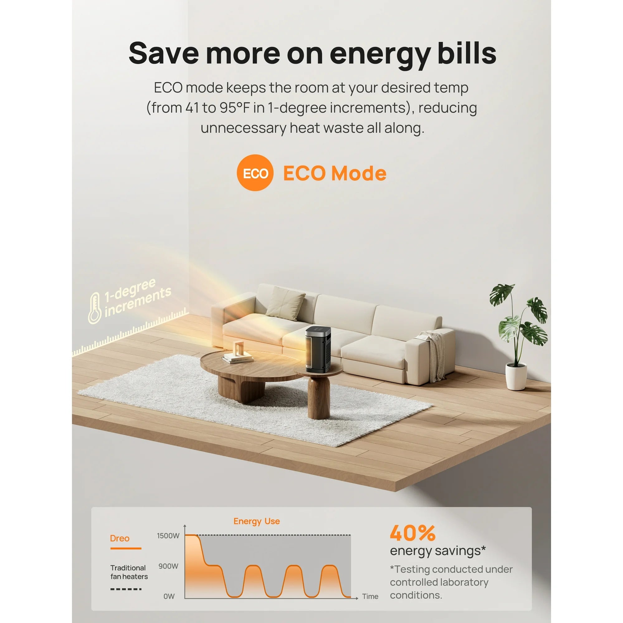 ECO Mode adjusts the heat level automatically to reach your desired temperature while saving more on energy bills. Personalize your own comfort with the digital thermostat from 41 to 95 ℉, adjustable in 1℉ increments. Precise Heat, Precise Comfort.