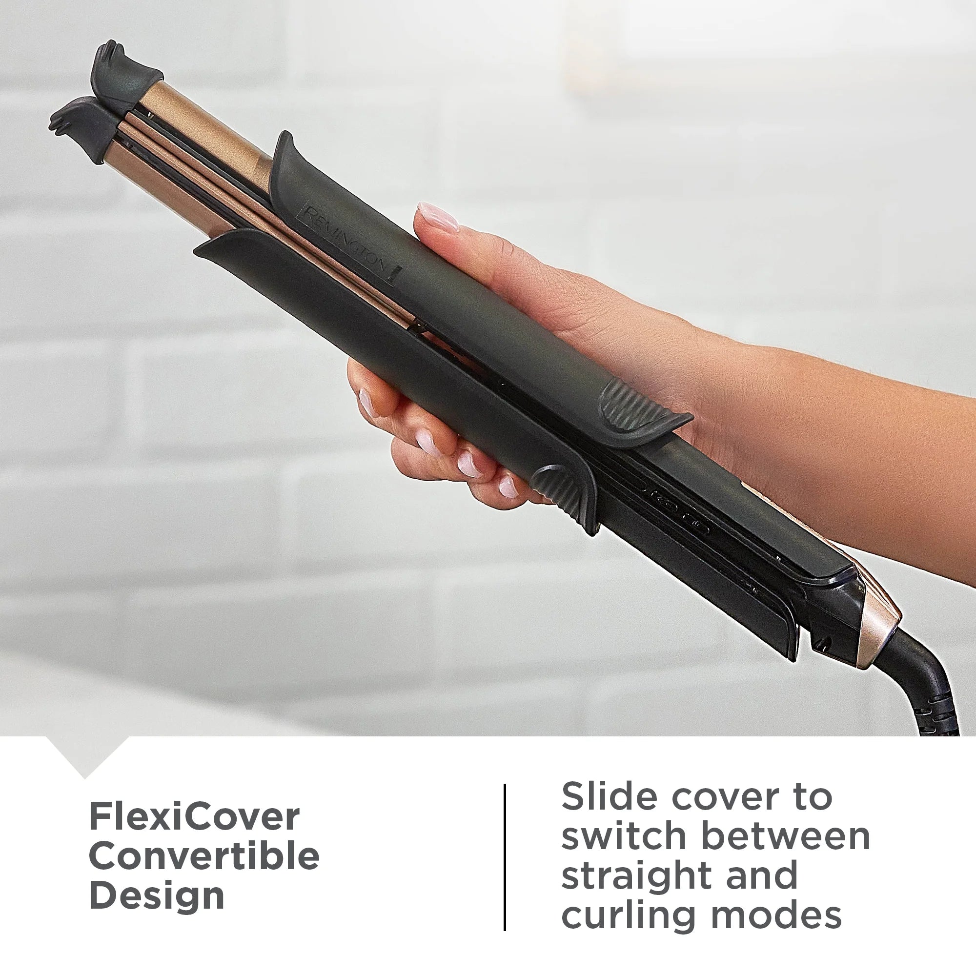 Feel your most confident and achieve the look you want with the REMINGTON FlexiStyle Flat Iron + Curler. Built with REMINGTON quality you can count on, this high-performing multi-styler easily converts from a flat iron to a curling barrel and back again in one easy glide. From smooth, sleek, and straight, to big, voluminous curl, FlexiStyle gives you the option to choose from multiple looks every time you style -- all without compromising results. 2x more heaters* deliver consistent heat and one-pass styling** while the adjustable heat range from 355°F - 450°F makes FlexiStyle ideal for all hair types. Designed